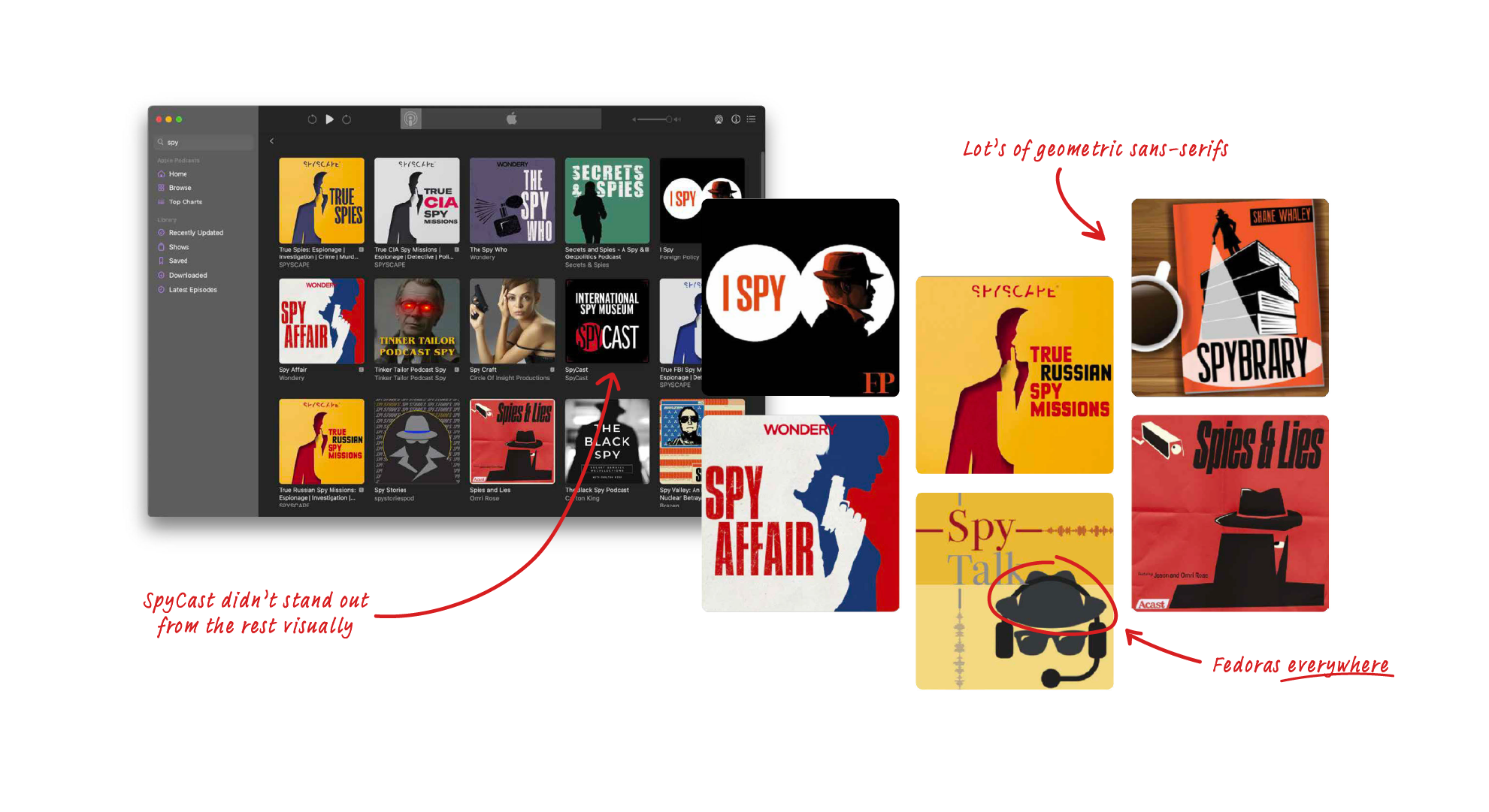 Reviewing popular podcasts in the history/espionage category revealed commonalities: Cold War typography, pop-culture tropes, dark colors, and so very many fedoras.
