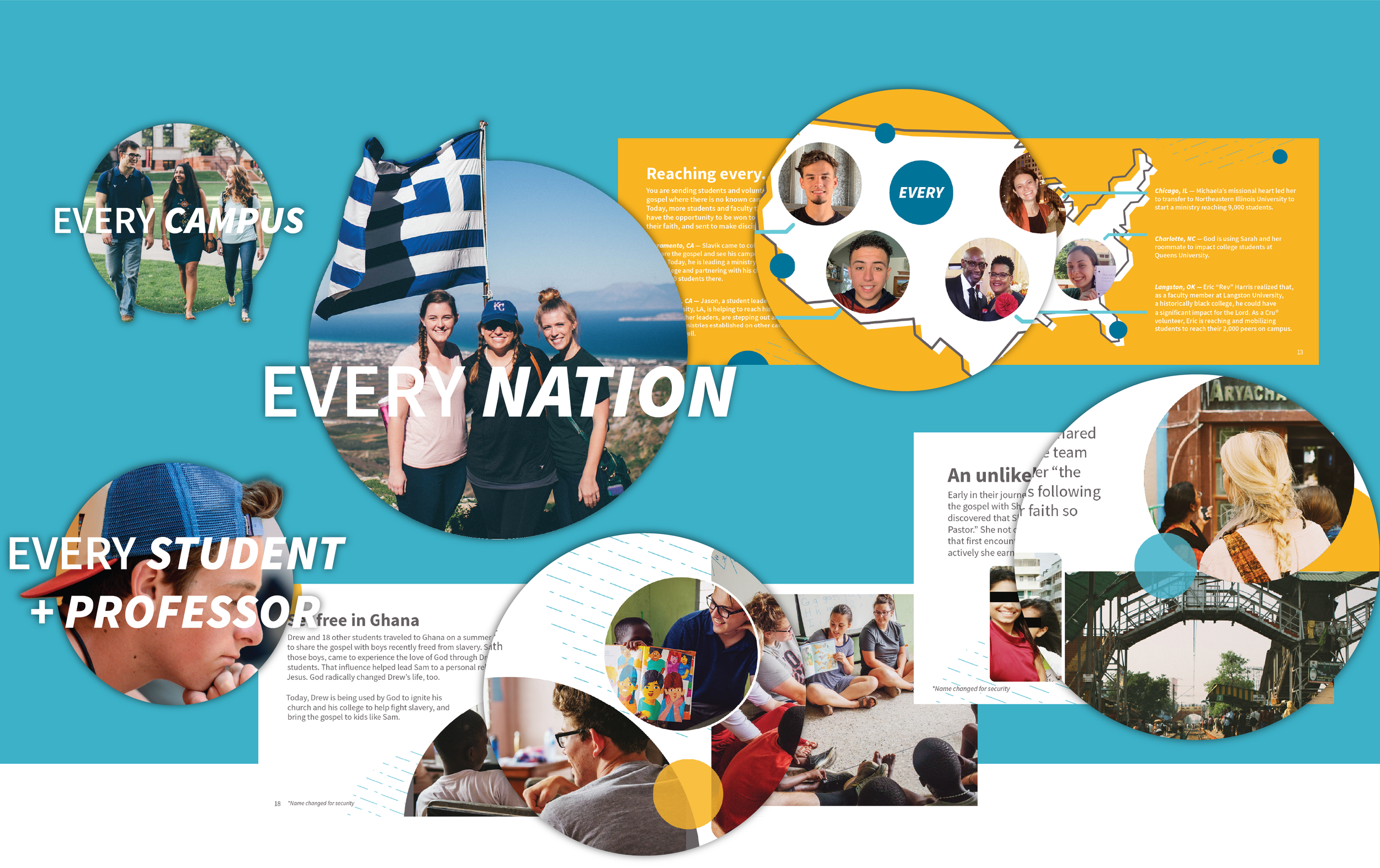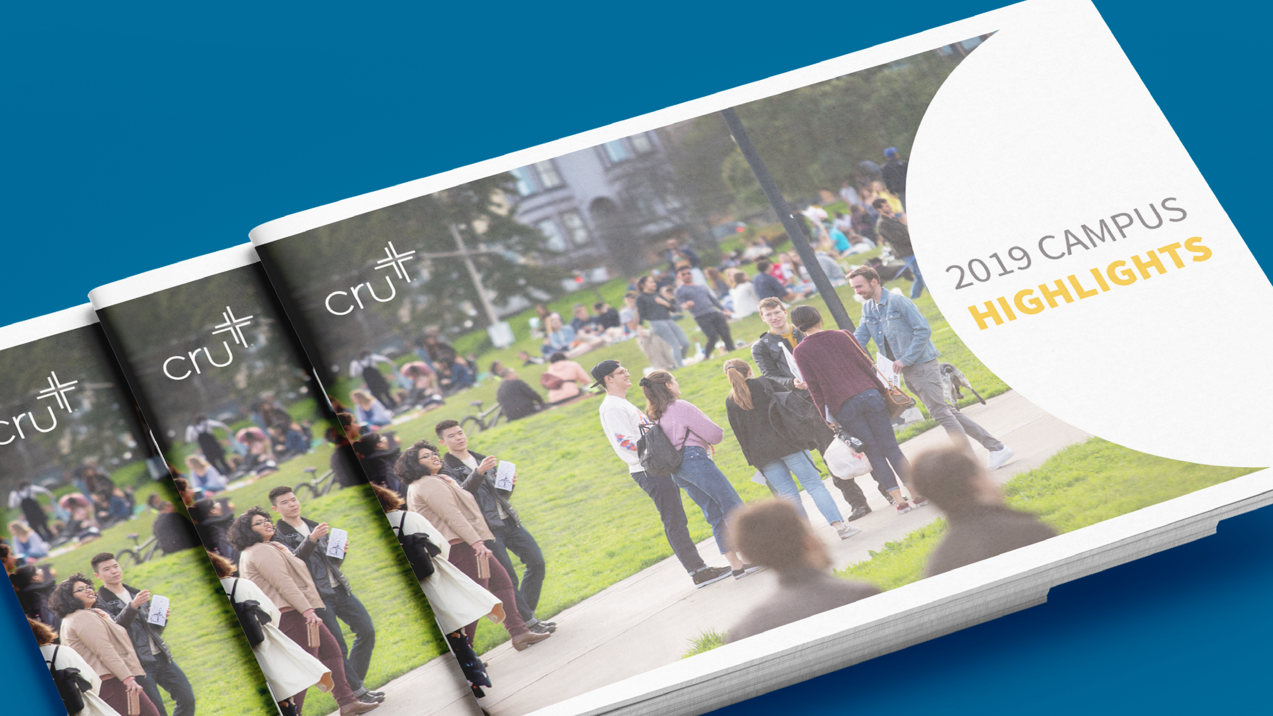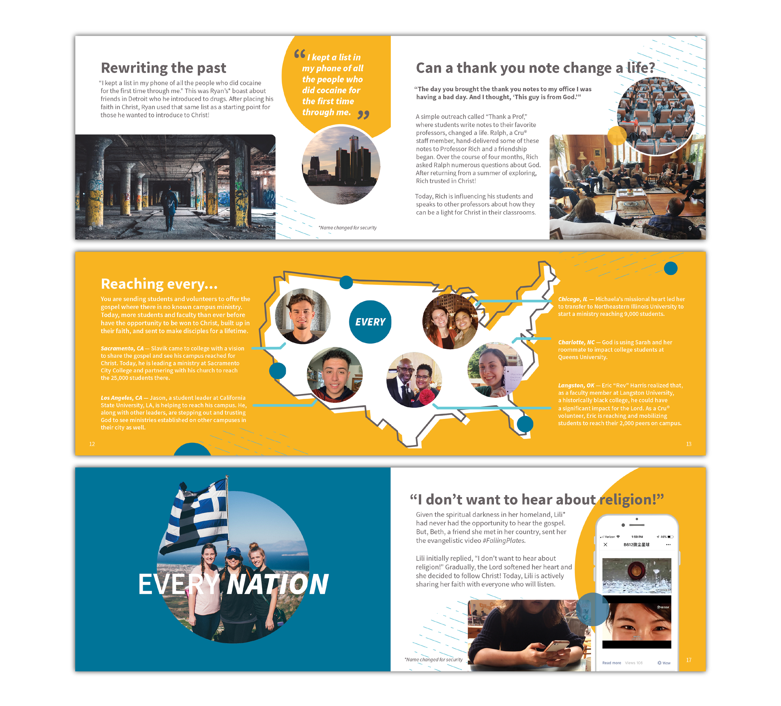 Cru, a religious non-profit whose main focus is empowering the spiritual growth of college students, does this through the annual production of the Campus Highlights booklet. In this document, the executive leadership and fund development teams partner with the in-house creative agency to share stories and stats that showcase and celebrate the progress made in the last year.