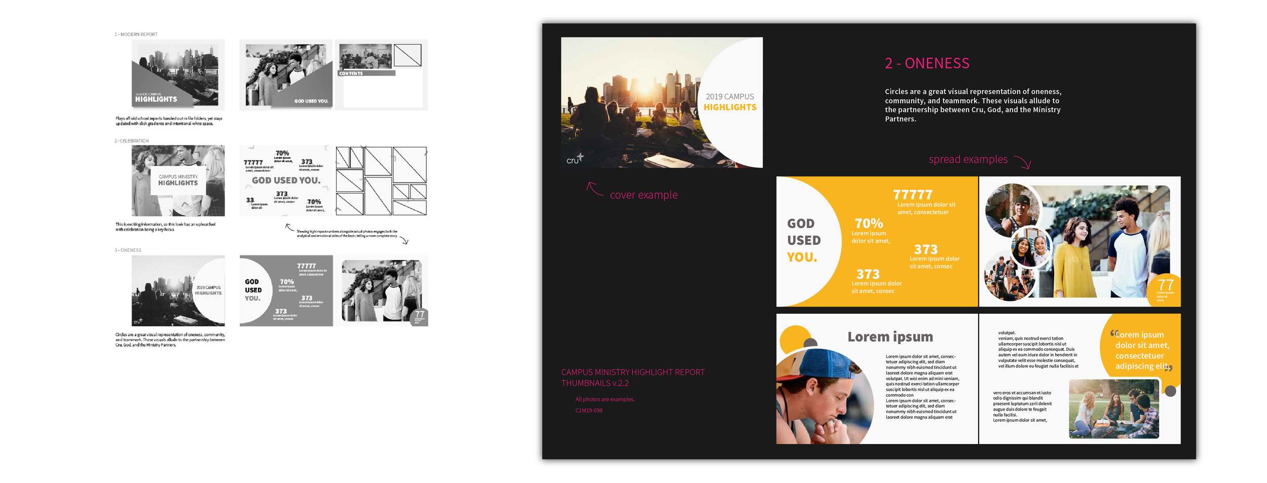 The visual theme of “oneness”, as represented by circles and rounded design elements, supports the overarching message of the content. Community and teamwork were both identified as key components of Cru’s ethos, as well as values that would encourage further engagement among stakeholders. Color and font choices aligned closely with Cru’s official brand standards.