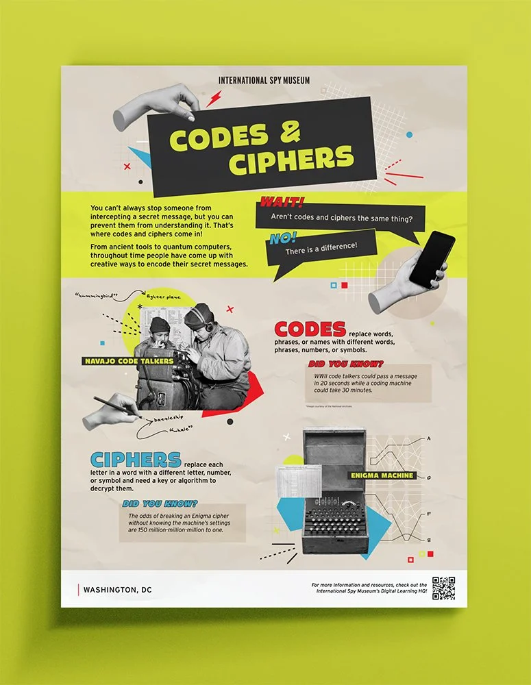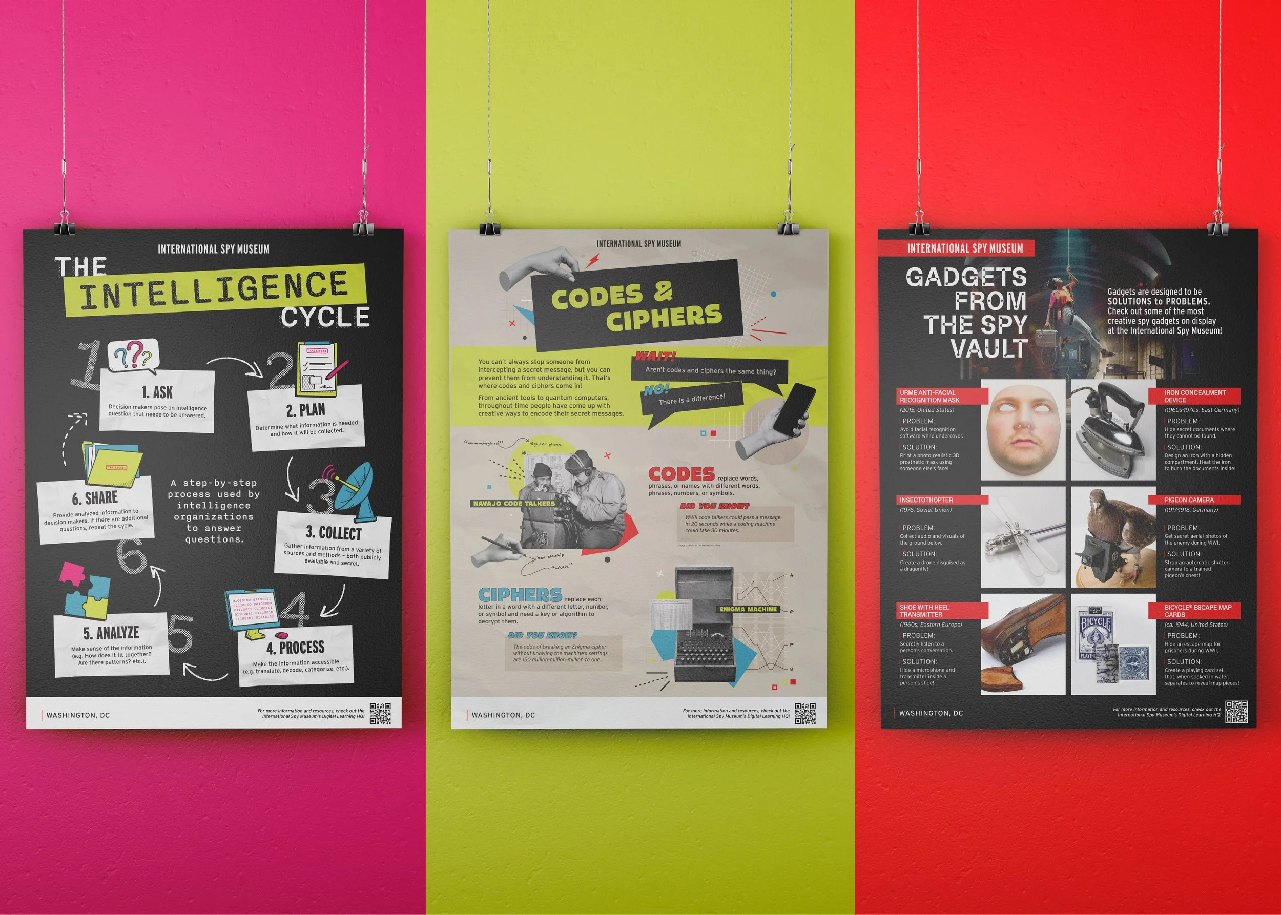 Teachers love to decorate their classroom walls, so I worked with our Youth Ed content team to develop three poster styles that would give teachers options. Science teacher? You might enjoy Gadgets From The SPY Vault with its slick visuals and problem/solution framework. Or maybe you’re a history teacher with a flair for the cute and nostalgic, then Codes and Ciphers is for you. If your goal is to spark curiosity about how the world works, your students might enjoy the bright colors and ideas behind The Intelligence Cycle.