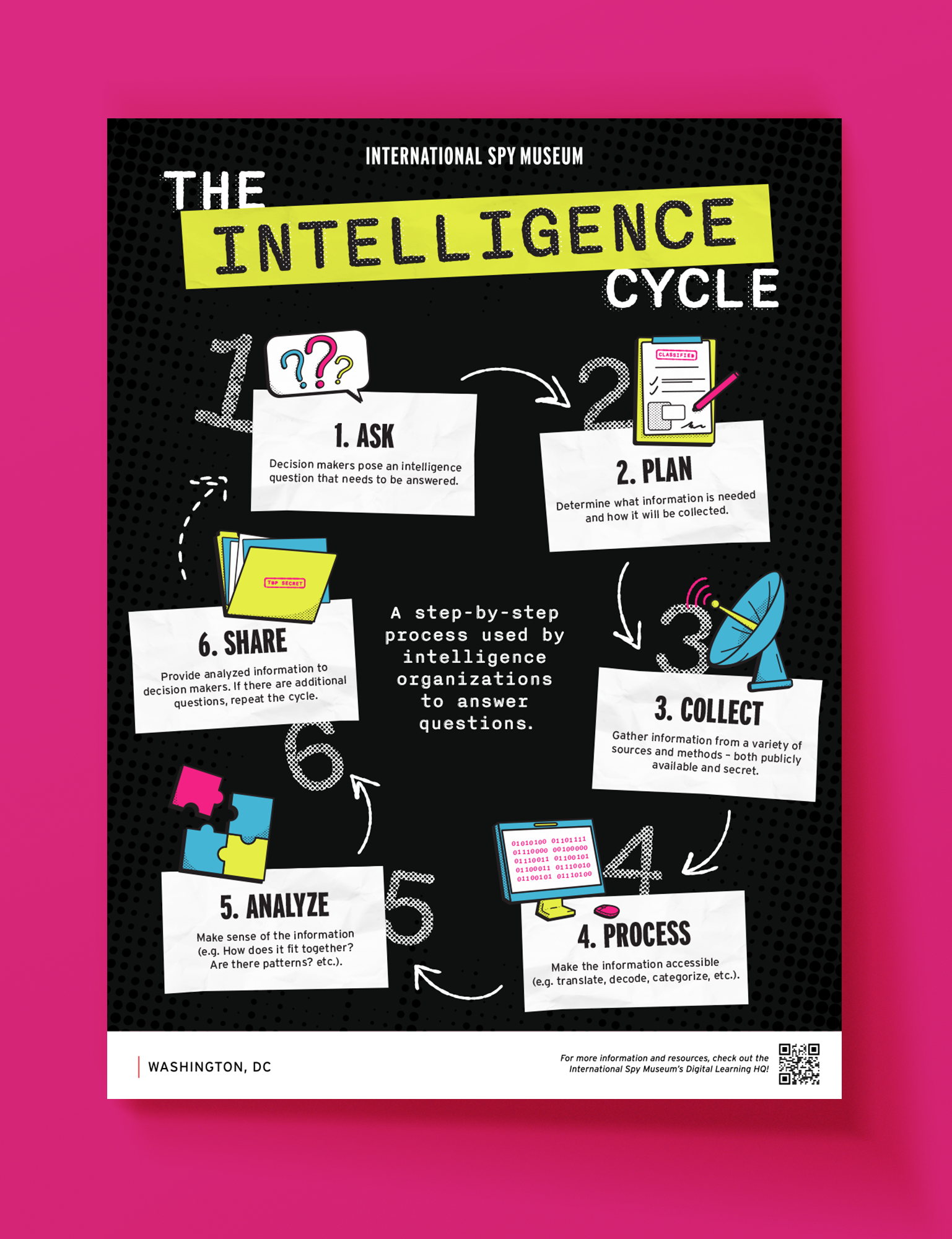 This poster series puts that mission on the wall. The collection covers The Intelligence Cycle (tracing how intelligence questions are researched and answered), an introduction to Codes and Ciphers, and Gadgets From The SPY Vault, showcasing iconic artifacts from the Museum's collections.