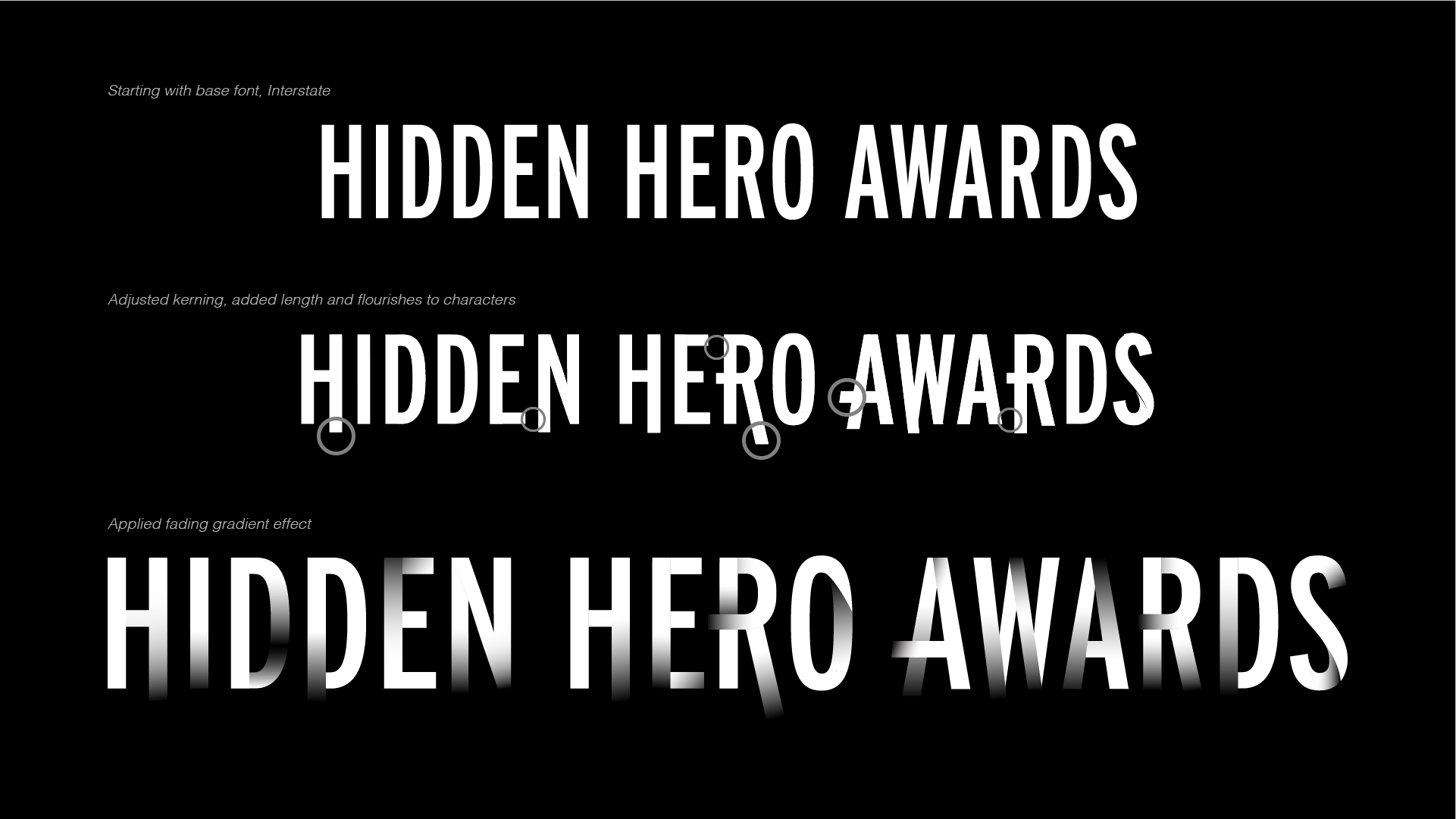 Starting with the Spy Museum’s primary brand font, Interstate, I adjusted each character, paying special attention to kerning and stretching elements of the font to add dynamic energy. This motion is further evoked by the gradient applied to each letter–creating the sense that it is melting out of the darkness. It reinforces the idea of a “grand reveal” and paves the way for great motion graphic elements.