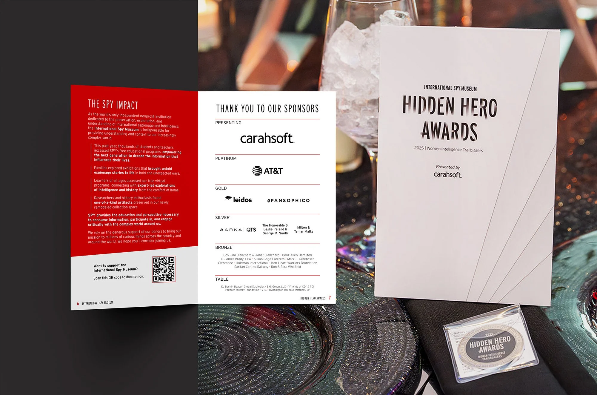 The 2025 Hidden Hero Awards was a huge success, completely selling out both tickets and sponsorships, bringing in over $700k in donations–exceeding budgets by 40%. Internally, it was the leanest production budget ever achieved by a Spy Museum event of its kind and it significantly reduced strain on internal teams to implement. Post-event debriefs highlighted minor learnings, but for the most part, our leadership’s resounding feedback was “let’s do that again”. The branding is flexible enough to adapt with each year, keeping things fresh, while also being distinctly “SPY” and an event that participants can look forward to for years to come.
